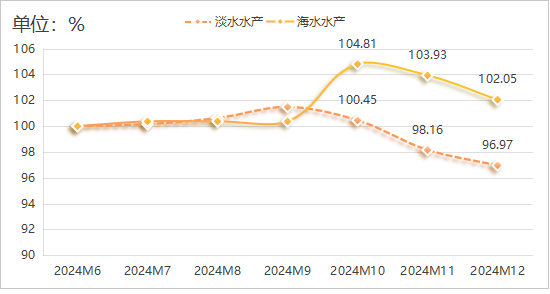 2024年12月,水产产物价钱指数再度回落,指数值为101。34点,环比下降1。73%。具体运转环境如下图所示: