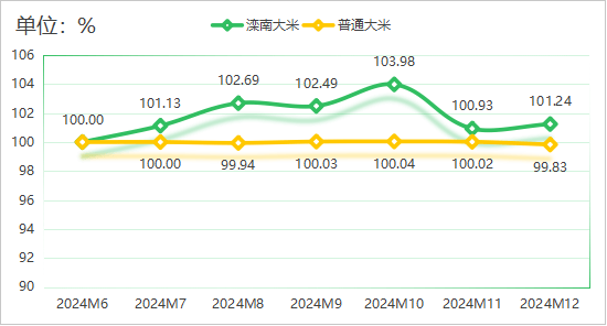 国际市场方面,结合国粮农组织(FAO)数据显示,2024年12月份全球大米价钱指数环比下跌1。2%。大米次要出口国米价均有小幅下滑,截至2024年12月末,泰国5%破裂率大米FOB报价501美元/吨,越南5%破裂率大米FOB报价485美元/吨,巴基斯坦5%破裂率大米FOB报价452美元/吨,印度5%破裂率大米FOB报价449美元/吨。跟着印度卢比贬值至汗青低点,印度大米出口价钱进一步下跌,大米出口商的利润被无效提高。日本米价则再立异高,日本农林水产省数据显示,2024年12月日本新米买卖价钱创下汗青新高,所有品种、用于从食的大米发卖给批发商的价钱是客岁同期的1。6倍,达每60公斤24665日元(约合人平易近币1162元),每公斤大米折合人平易近币价钱跨越19元。总体上看,国际大米到岸税后价仍高于国内,中国农业消息网数据显示,12月份,配额内1%关税下泰国大米到岸税后价每斤2。1元,比国内晚籼米批发价每斤高0。06元;离岸价折人平易近币每斤1。8元,比国内低0。24元。进出口方面,我国大米进口量同比大幅下降,海关数据显示,2024年全年,我国累计进口大米166万吨,同比下降37。1%;累计进口额67。95亿元,同比下降32。5%。大米出口同样呈现下降趋向,海关数据显示,2024年全年,我国累计出口大米111万吨,同比下降30。8%;累计进口额45。22亿元,同比下降28。2%。此中12月份,我国大米进口38万吨,同比增加63。9%,进口额16。21亿元,同比增加44。0%;大米出口5万吨,同比下降73。9%,出口额1。97亿元,同比下降75。4%。国内市场方面,12月份以来,南方地域中晚稻收购渐入尾声,稻谷托市收购无力有序推进,对不变市场价钱阐扬了环节感化,中晚籼稻收购价维持平稳,粳稻大量上市,阶段性供大于需,收购价稳中偏弱运转。优良粮价钱仍较有劣势,国度粮油消息核心数据显示,2025年1月8日江西“黄华占”(优良稻谷)收购价2900元/吨,高于通俗中晚籼稻收购价310元/吨;湖南“黄华占”收购价2800元/吨,高于通俗中晚籼稻收购价180元/吨。分项产物价钱指数方面,滦南大米价钱指数回升,2024年12月指数上行至101。24点,环比增加0。31%。此中散拆滦南大米价钱指数维持正在103。50点平稳运转;包拆滦南大米价钱指数有所回升,指数值为98。98点,环比增加0。64%。通俗大米价钱指数走弱,12月指数值为99。83点,此中籼米取粳米价钱指数均有小幅下滑,指数值别离为99。62点和100。31点。分项指数具体走势见下图: