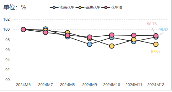 供给方面,2024/2025产季我国花出产量同比持平,叠加陈季花生结转库存,全体来看,花生根基面延续供需宽松款式。跟着春节假期临近,农户和经销商出货心理松动,农户惜售情感有所缓解,产区供给总体优良,供强需弱特征仍然较着。跟着各购销从体收购进入尾声,节前市场很难构成买卖高峰,市场买卖量将逐步缩减。需求方面,市场需求仍然较弱。一方面市场决心遍及不脚,油脂期货价钱遍及处于低位,采购商将连结择价按需采购为从,市场价钱跟涨难度较大,但花生期货目前价钱有所回升,后期市场决心预期改善。另一方面,近期油厂到货平稳,但部门工场严控质量、限量收购,跟着春节到来,油厂将连续颁布发表停机、停收,货源耗损渠道将会愈加单一,降低购销两边的入市热情。估计除夕后国内花生市场将维持区间盘桓行情,难以形成趋向性上涨。进出口方面,海关数据显示,2024年12月,中国花生进口量37291。69吨,出口量18098。4吨,较11月有所下降。2024年中国全年花生累计进口759514。35吨,同比增加14。93%;全年花生累计出口144617。56吨,同比增加37。11%。同时本年度以来,国际花生现货也呈现下跌趋向,目前价钱取2021年雷同,较岁首年月走弱500美元/吨摆布。从目前察看来看,美国、印度、阿根廷和巴西花生均实现减产,2025年国际花生估计价钱继续承压。分项产物价钱指数方面,三大分项指数呈现“一涨一平一跌”,此中滦南花生价钱指数呈现小幅回升,环比增加0。91%;花生油价钱指数连结平稳运转,指数值为98。76点;通俗花生价钱指数小幅下滑,12月指数值环比下降0。94%至97。07点。分项指数具体走势见下图: