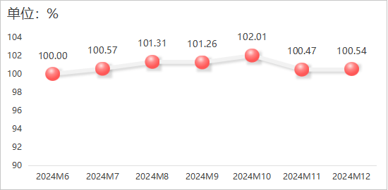 2024年12月,大米产物价钱指数小幅回升,指数值为100。54点,较上月增加0。07个百分点。具体运转环境如下图所示:
