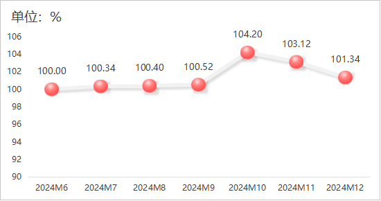 2024年12月,水产产物价钱指数再度回落,指数值为101。34点,环比下降1。73%。具体运转环境如下图所示:
